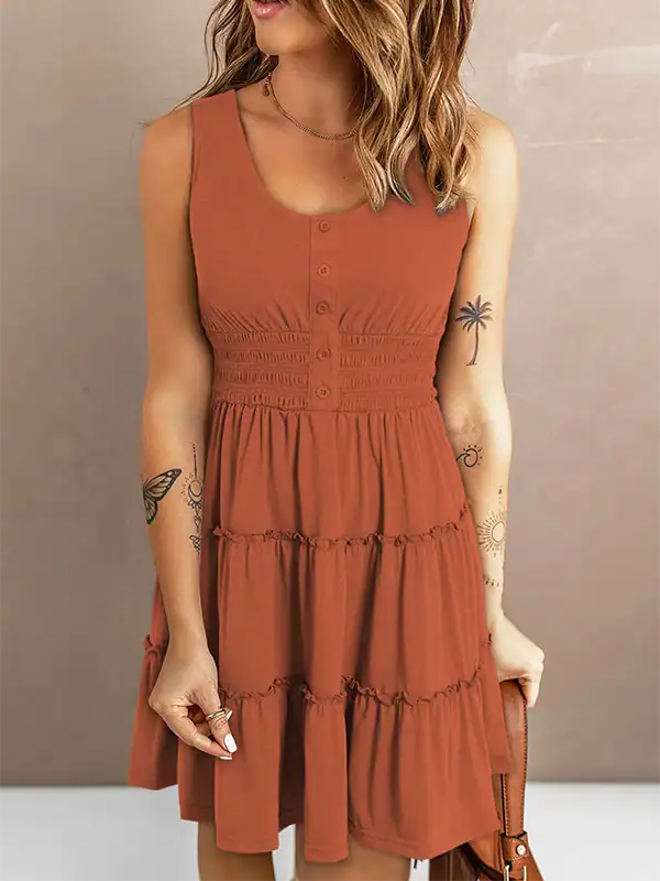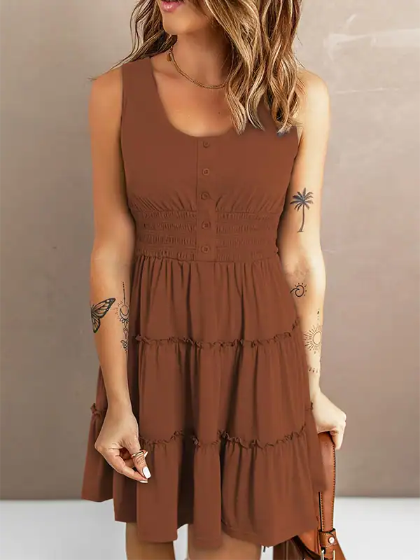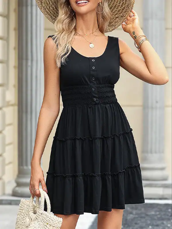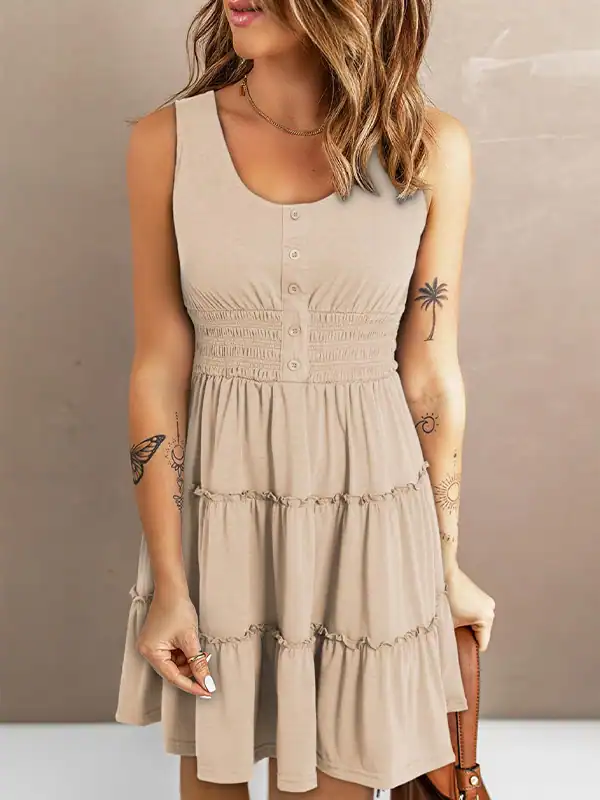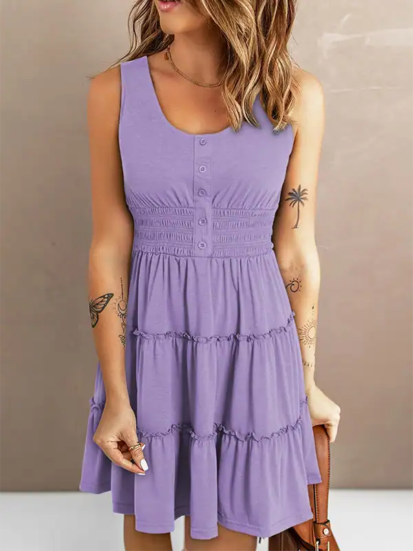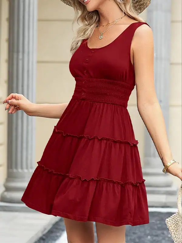 Design Highlights: Sleeveless design with decorative button front, scoop neckline, smocked waistband, and empire waist silhouette. Features a flowy ruffle-tiered skirt in an A-line cut that flatters different body shapes.