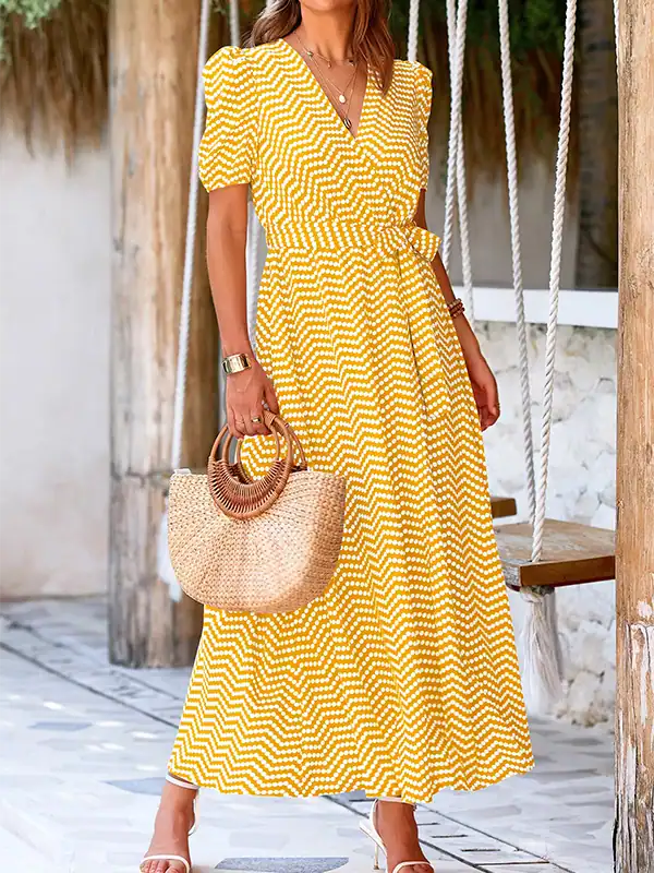 Design: Elegant wrap V-neck, short sleeves, high waist, asymmetric ruffle trim, side slit, and removable waist tie.