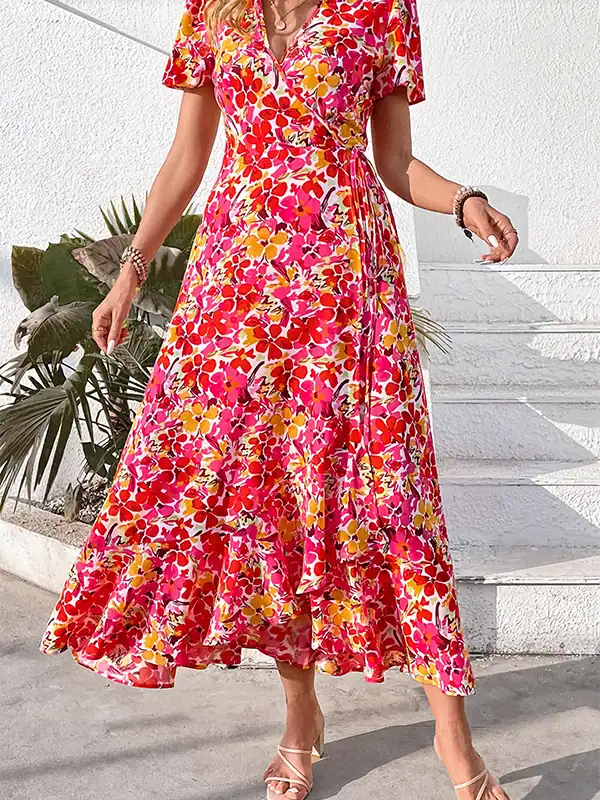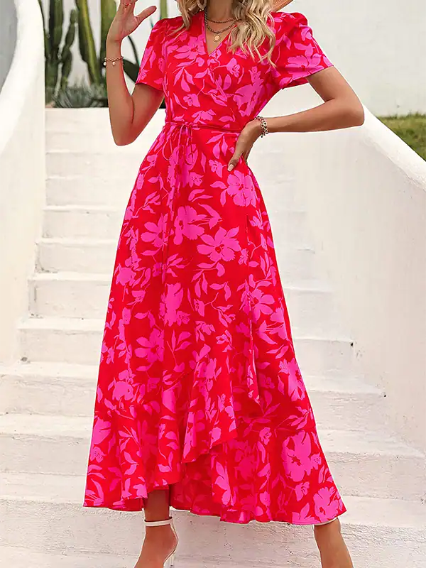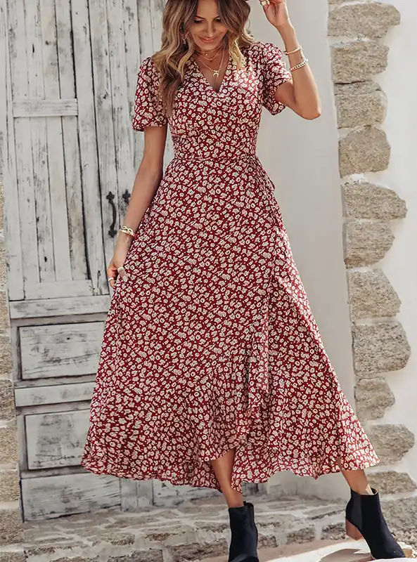 Custom Summer Maxi Dress Supplier – Boho Floral Wrap Long Dress with Side Slit and Short Sleeves