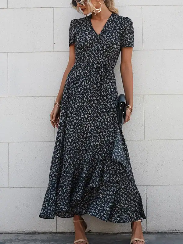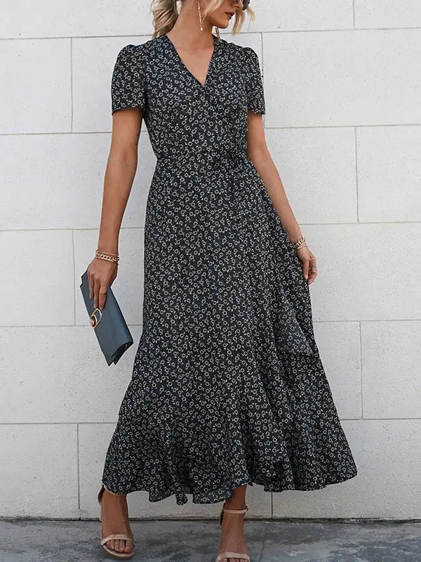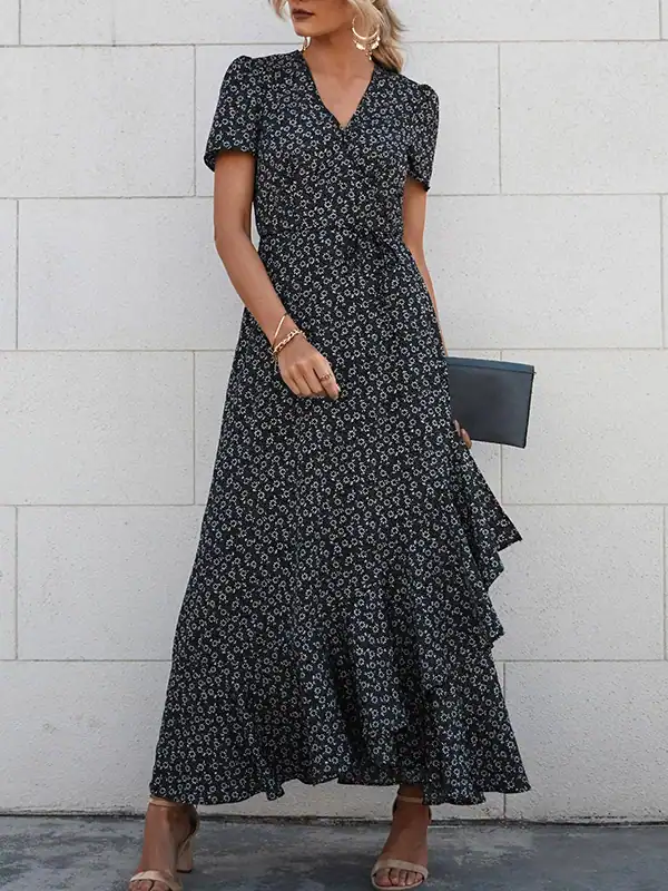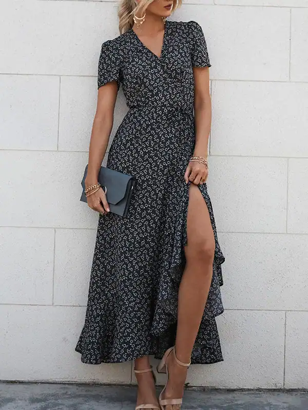 Design: Elegant wrap V-neck, short sleeves, high waist, asymmetric ruffle trim, side slit, and removable waist tie.
