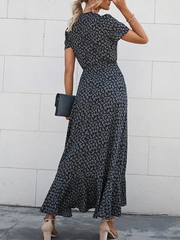 Custom Summer Maxi Dress Supplier – Boho Floral Wrap Long Dress with Side Slit and Short Sleeves