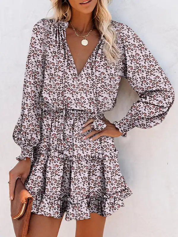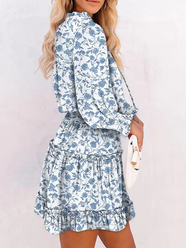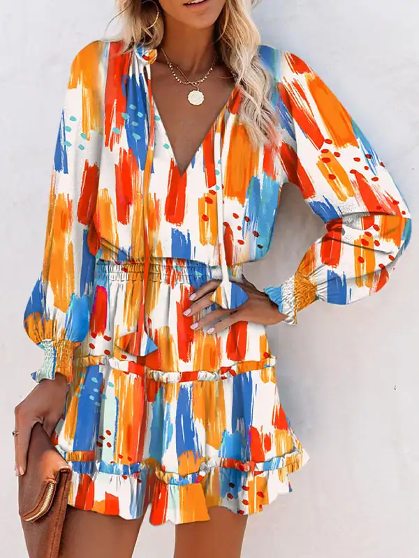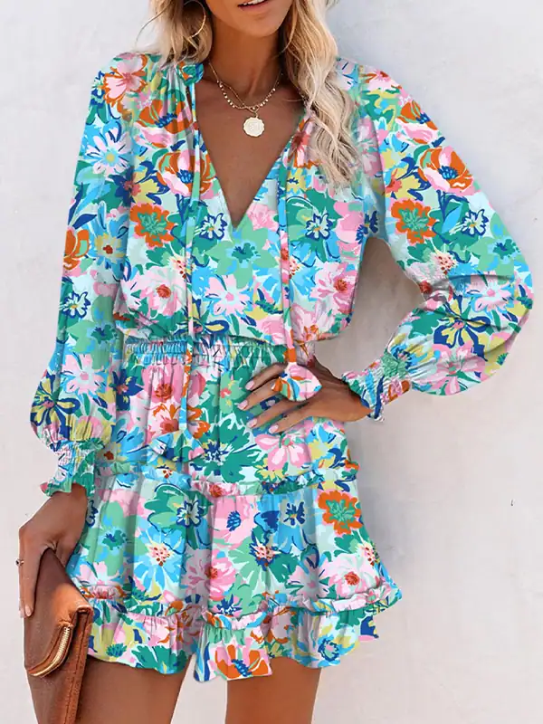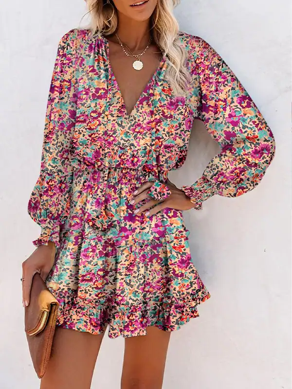 This women’s boho floral dress features a split V-neckline, smocked elastic waistband, and ruffle-tiered skirt for a flattering yet comfortable fit. Designed with long sleeves and stretchy smocked cuffs, it combines elegance and ease, making it an ideal choice for casual and chic collections. Crafted from lightweight chiffon, this mini-length dress drapes beautifully while remaining breathable and skin-friendly.