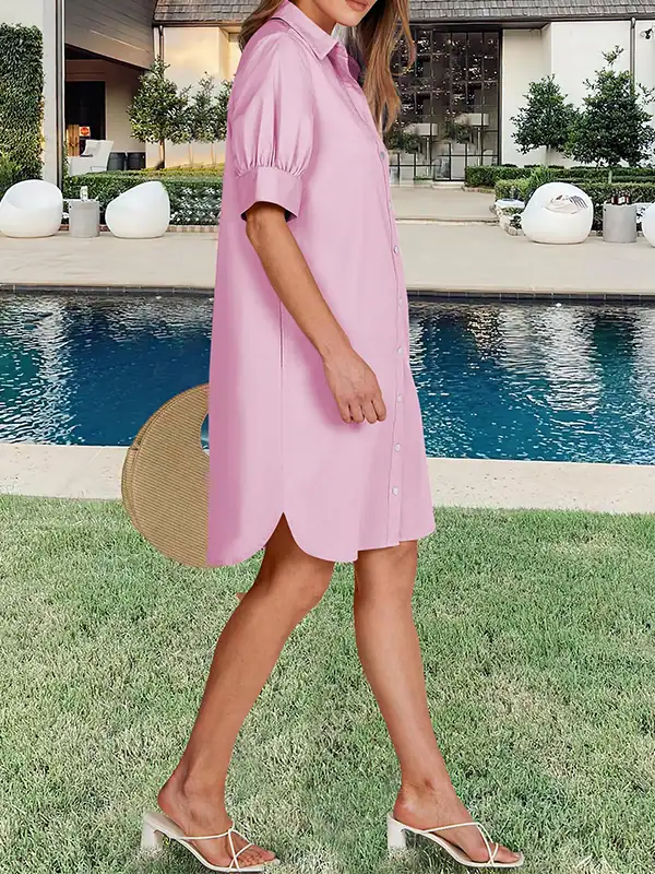 Style: Button-down front, V-neck, short sleeves, loose fit, above-knee length