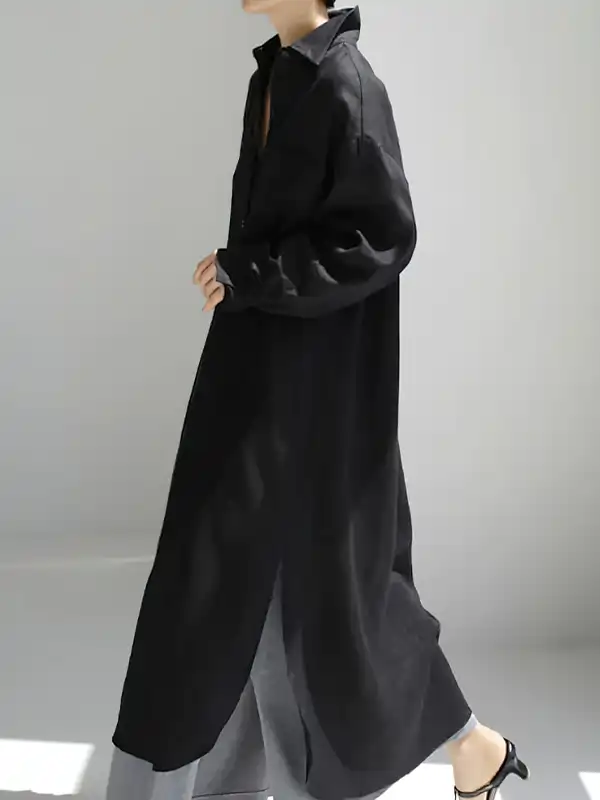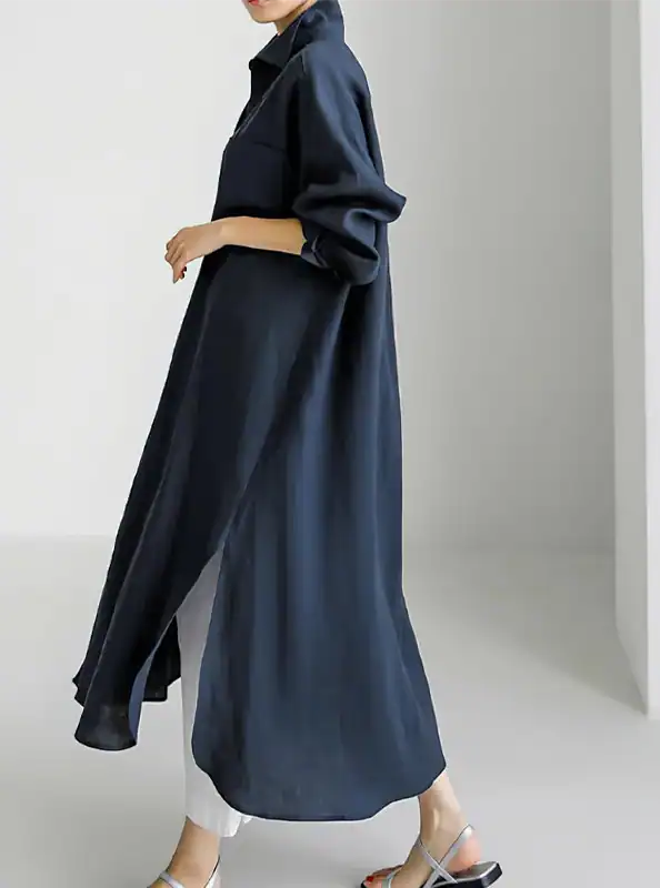 We manufacture women’s loose-fit maxi shirt dresses suitable for spring and summer collections. Featuring a single-breasted button-down front, turn-down collar, back pleated design, long sleeves with buttoned cuffs, dropped shoulders, patch chest pocket, and side slit, this cotton tunic dress combines comfort, breathability, and versatile styling. Available in apricot, black, and navy blue.