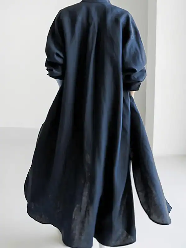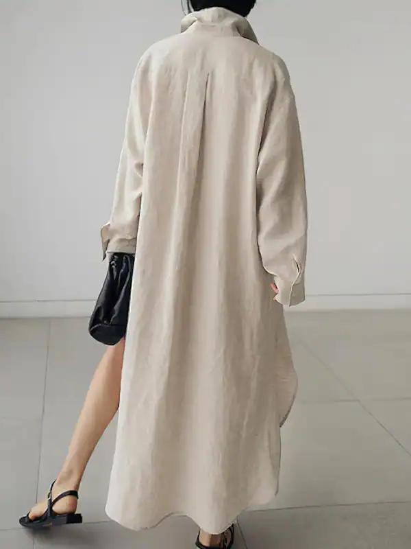 Style: Front single-breasted button-down closure, turn-down collar, back pleated design, long sleeves with buttoned cuffs, dropped shoulder, patch chest pocket, below-knee length, side slit