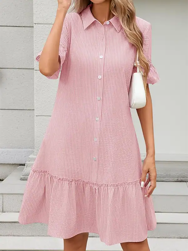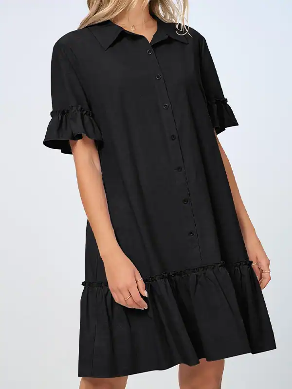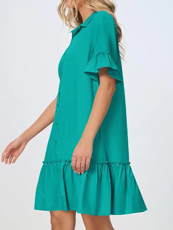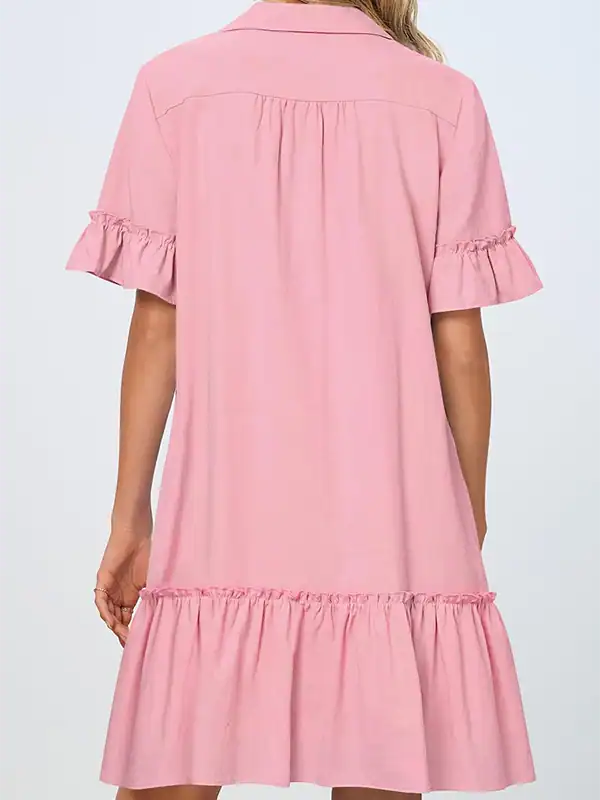 Style: V-neck lapel collar, button-up front, short sleeves with ruffle hem, pleated swing hem, mini length, loose-fit shift silhouette