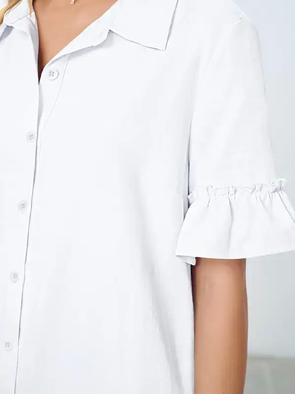 We manufacture women’s casual button-down mini shirt dresses suitable for summer collections. Featuring a V-neck lapel collar, short sleeves with ruffle hem, button-up front, pleated swing hem, and two side seam pockets, this loose-fit mini shift dress combines comfort, style, and functionality. Crafted from a breathable cotton blend with delicate double lining, it is soft, lightweight, and ideal for daily wear. Available in solid colors.
