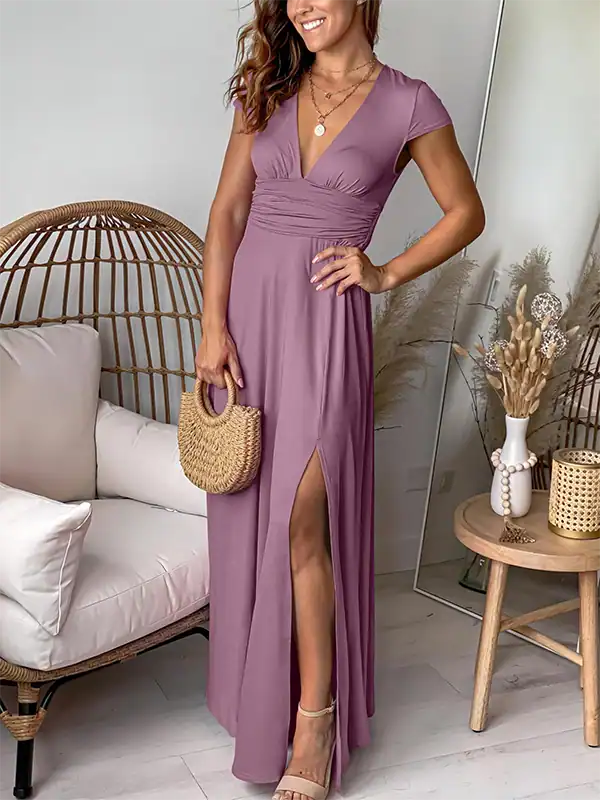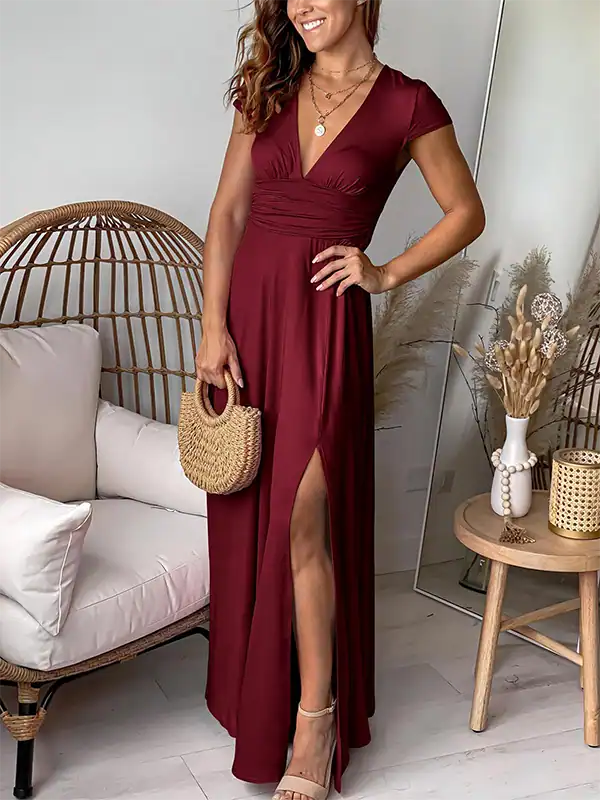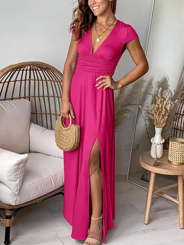 The floor-length maxi silhouette features a deep V neckline, short cap sleeves, and a side slit for a graceful yet modern touch. A pleated high waist with smocked back enhances your natural curves while ensuring flexibility and ease of movement. Whether you’re attending a wedding, cocktail party, evening celebration, or vacation getaway, this dress is your go-to outfit for any formal or semi-formal occasion.
