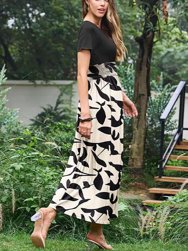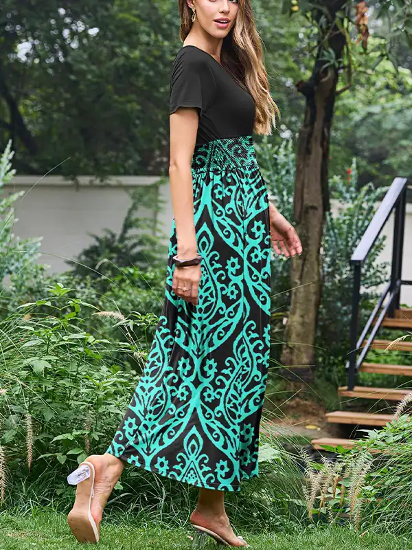 Short sleeves, crew neck, and smocked waist provide comfort without compromising style. Available in floral prints, patterns, or solid colors, with two side pockets and floor-length hem. Lightweight, breathable fabric ensures wearability, while elastic at the waist allows flexible sizing. Full customization options include colors, prints, fabrics, and sizes.