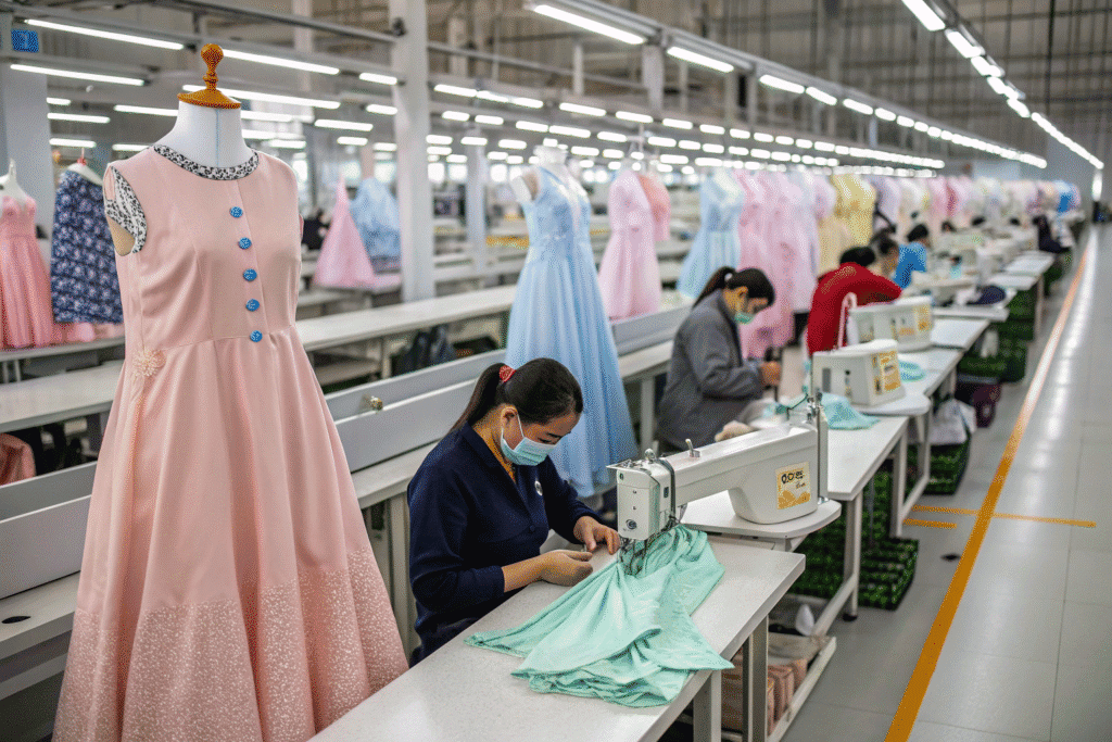 “Professional garment factory environment with seamstresses sewing dresses, high clarity, realistic lighting, documentary style.”